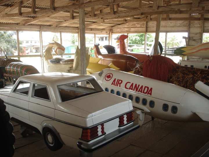 The coffins were not what I would describe as high art, but they were strangely stirring. The story goes that a popular craftsman was building a chair in the shape of a cocoa pod for a village chief when the chief suddenly died. Instead of finishing the chair, the artisan turned it into a coffin instead.