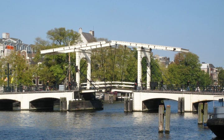 The city’s most famous bridge is Magere Brug or Skinny Bridge. It is a traditional double-leaf, Dutch drawing bridge that connects the banks of the Amstel River. The bridge opens up about every 20 minutes to let boats go through.