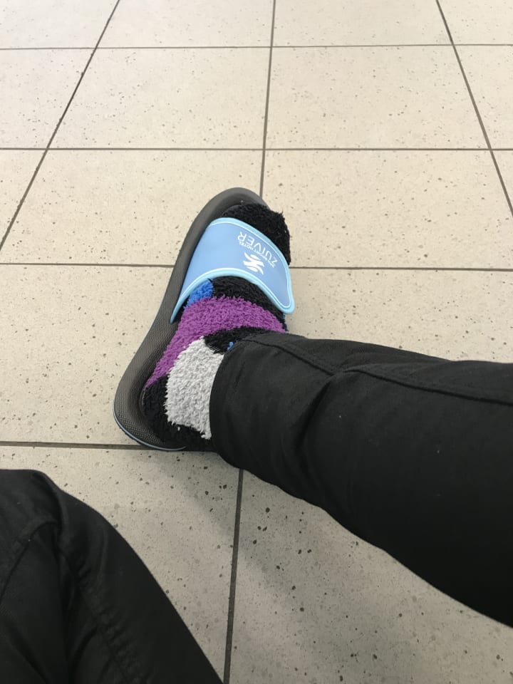 We got really lucky in that we went to a spa the day before the tattoo, and I picked up some cheap Velcro sandals, and I was able to put thick socks over the bandages, slip it into the sandal and fashion a makeshift “medical boot” for my poor foot: