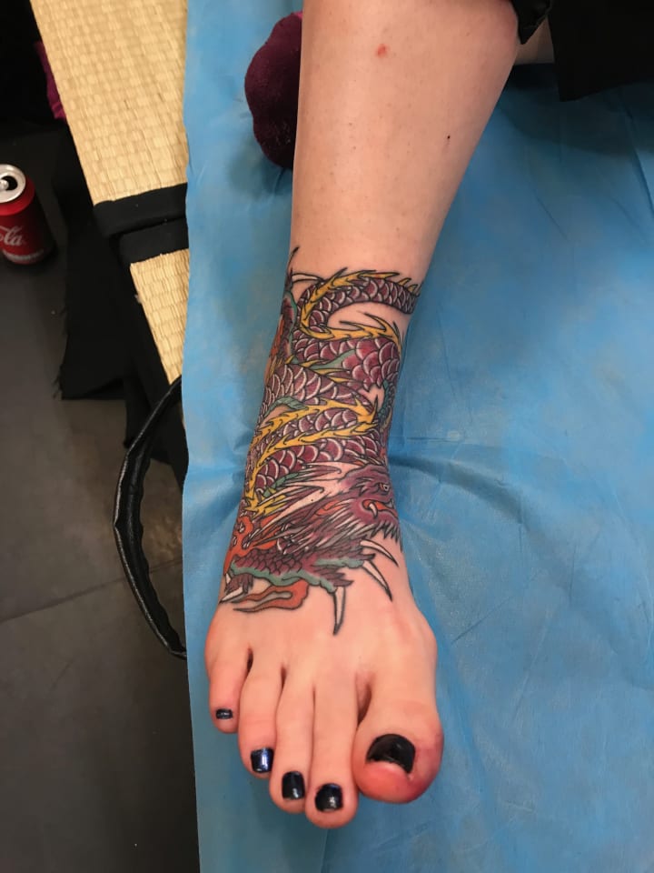 When I was 19 years old, I got it in my brain (I don’t know – 19 year olds get lots of crazy ideas, but I’m especially prone to them) to get a giant Japanese dragon tattooed across my foot. I saw a local artist in Seattle, it took several sessions and was pretty much the worst pain I had experienced in my life up until that point (little did I know).