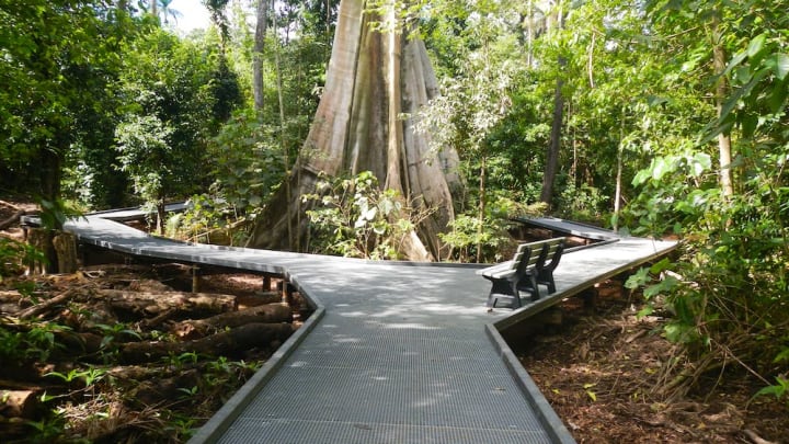 Visit the scenic Abergowrie State Forest. Here you’ll find tropical rainforests, open eucalypt forests, and exotic pine plantations. All of this is adjacent to the Wet Tropics World Heritage Area. There is a large grassy clearing known as Broadwater that is shaded by tall eucalypts by the cool, clear waters of Broadwater Creek. You can set up camp here and take a walk along the 1.6-kilometer return Rainforest walk through the endangered riparian rainforest and take a look at the huge old Broadwater fig tree. Along the longer 3-kilometer return Creek you can walk through eucalypt and riparian forests to the wonderful pools along Broadwater Creek and take a refreshing swim. In the rainforest, you can bird watch and look for wallabies in the open forest in the afternoons.