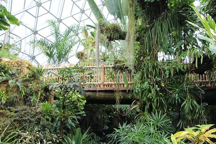 The highlight is Climatron, a geodesic-dome greenhouse with a rainforest-like climate, dense tropical foliage, and a river aquarium with exotic fish. Over 2,800 plants grow inside among them cacao and coffee. There is a 14-acre Japanese strolling garden which is one of the oldest in the country and a glass butterfly conservatory with over 60 species of butterflies and 100 species of exotic flowering plants.