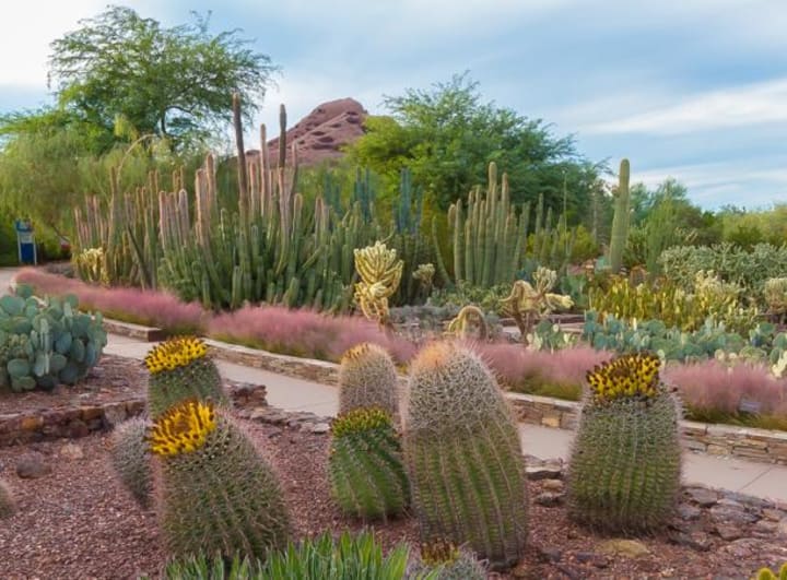 Desert Botanical Garden in Phoenix, Arizona is located among the red rocks of the Papago Buttes. There are over 50,000 arid plants and 4,482 species in the unique collection. Of these 379 are rare and endangered and in existence for 81 years. The garden has desert landscaping and five themed hiking trails. The Desert Wildflower Loop features hummingbirds among cactuses.