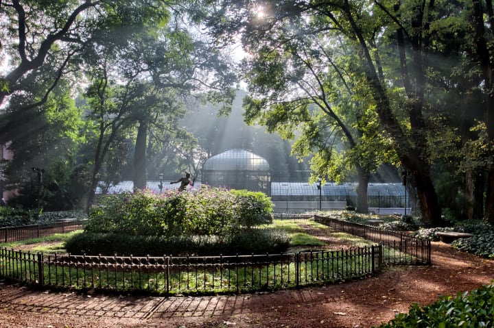 Buenos Aires Botanical Garden in Buenos Aires, Argentina was designed by French architect Charles Thays in 1891. You can walk along the dense foliage with marble statues and Art Nouveau greenhouses. The garden was declared a national monument in 1996. There are French, Roman, and Oriental gardens.