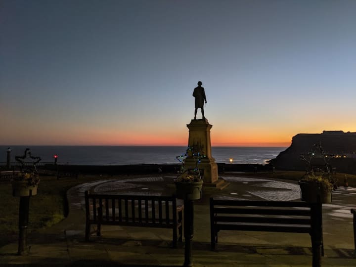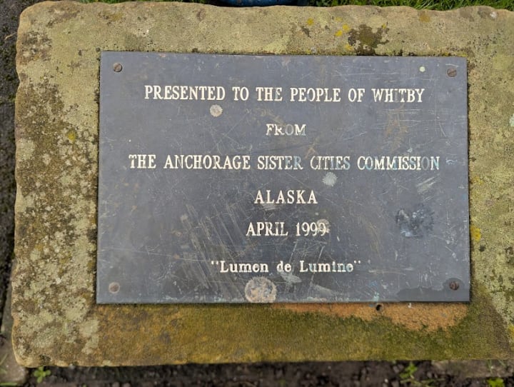 While I was walking in Pannett Park, I noticed the lamp post above and found it was presented to Whitby from its sister city, Anchorage, in Alaska. Below is the plaque, and then I remember the statue of Captain Cook on West Cliff that has a similar inscription, but I don't have a personal picture of this. I found this:
