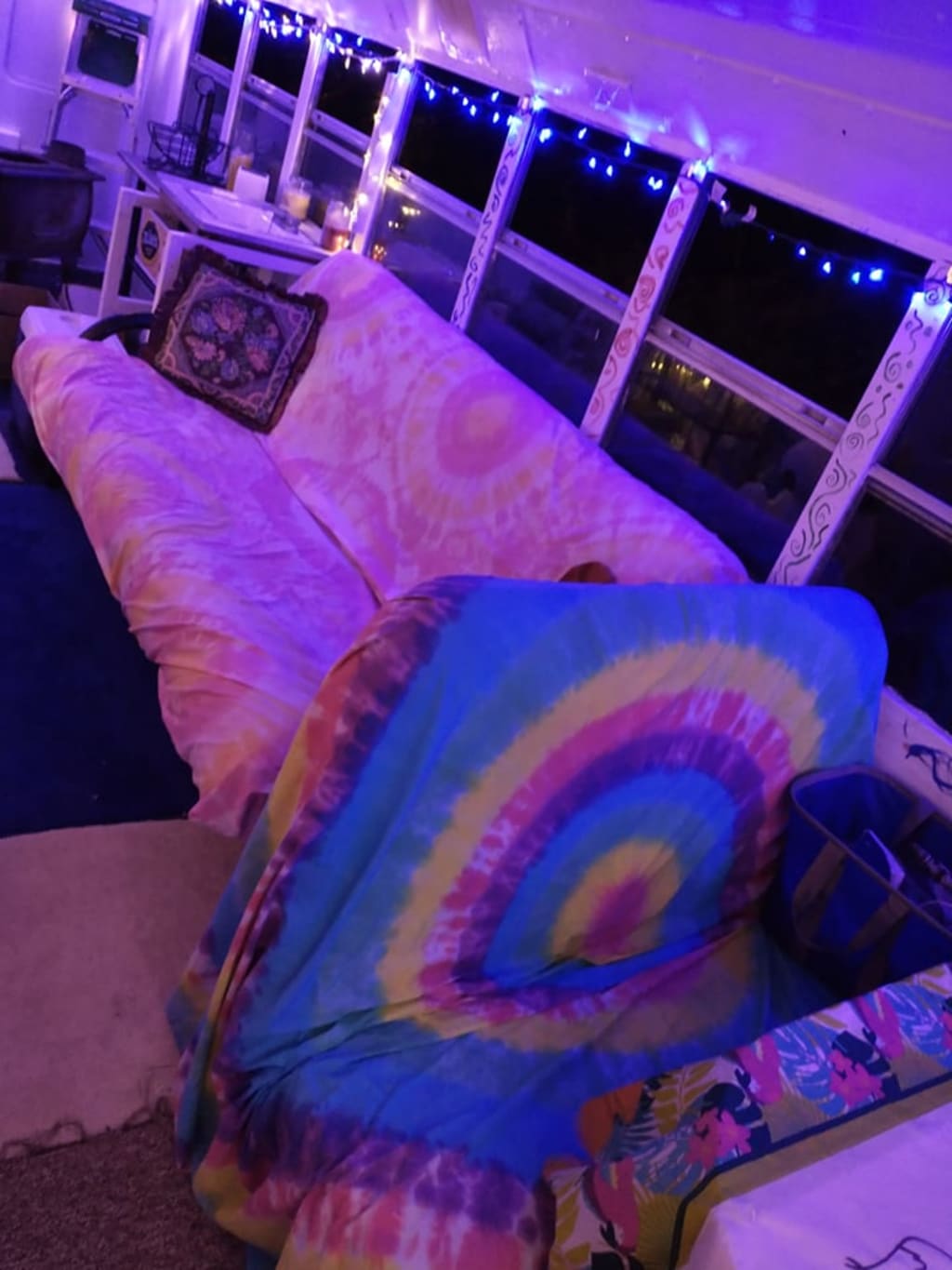 It's been 2 years since I have had the bus and it is looking so cool. So far, 5 cans of white paint on the inside and one can of light blue on the outside. I was planning on painting it like the Partridge Family bus on the outside, but I changed my mind to hippy flowers and peace signs and stuff because that is the theme of the bus. Lately, I got crazy one night and painted the inside with a bunch of glow-in-the-dark paint, lol. It looks so trippy at night now. It still needs a lot of work, but I just take it one project at a time.