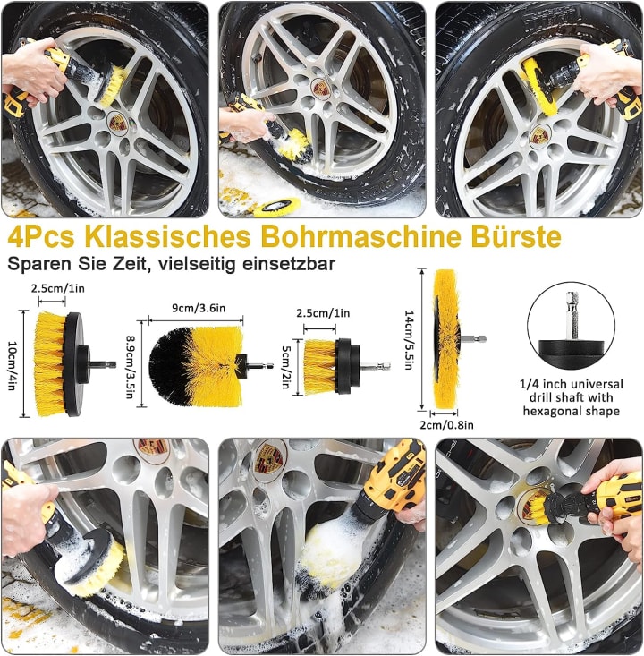 4 x classic drill brushes: the 4 battery drill brush made of high-quality polypropylene, wear-resistant and heat-resistant. Easy to scrub hard-to-reach or large areas, removes stubborn stains faster and provides a more thorough clean, perfect for car hubs care. Can also be used to clean bathroom floors, cement, upholstery, tiles, showers, kitchens, bathtubs and carpets (except battery drill).