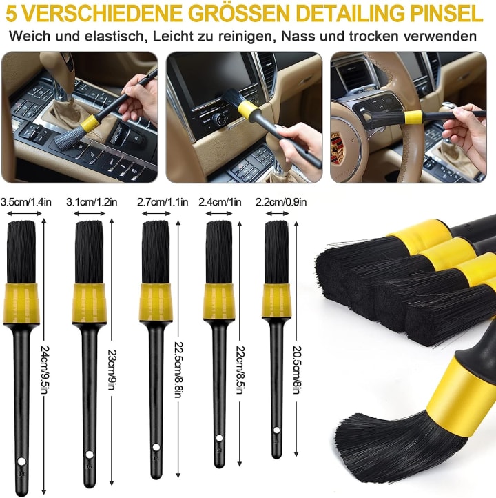 5 sizes car detailing brushes: 5 premium detailing brushes in different sizes made of PP silk, mixed with bristles and microfibre, for all cleaning care inside and outside the car. It can reach the smallest areas or hard-to-reach places. The bristles are firm enough to move but soft enough not to damage delicate surfaces such as glass, painted and polished surfaces.