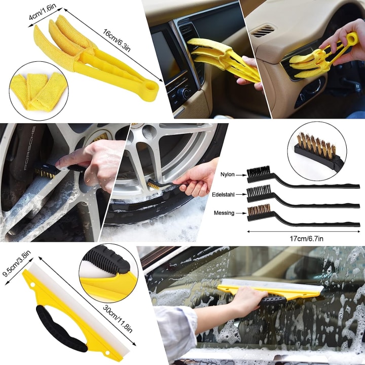 Wide use car care set: this fully equipped car cleaning set is perfect for cleaning your car inside and outside as well as for daily household cleaning. Can be used for cleaning wheels, tyres, rims, interior mudguards, carpets, floor mats, chassis, household floors, tiles, motorcycles, bicycles, kitchens, etc. The perfect gift for a friend or car lover.