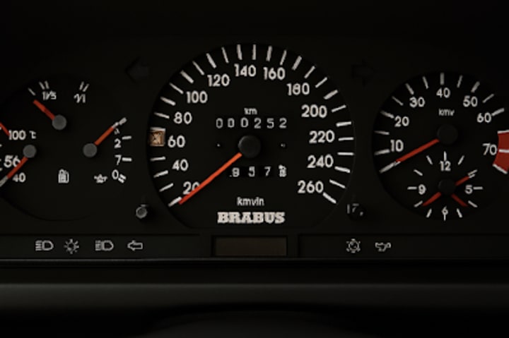 Close-up of Mercedes-Benz E500 Brabus instrument cluster showing 300 km/h speedometer, tachometer, odometer, and performance gauges