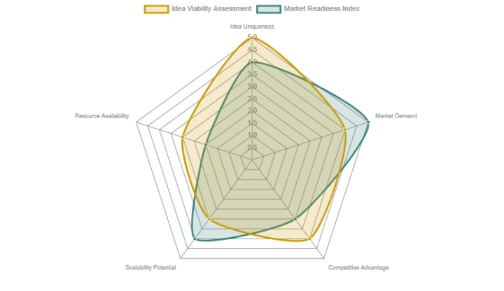 This radar chart illustrates the typical assessment of a business idea's viability and market readiness, scoring key attributes on a scale of 1 to 5.
