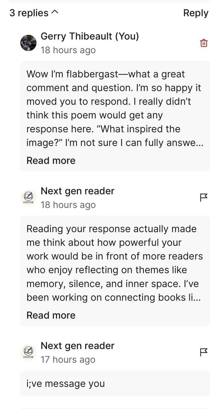 Below is the poem I posted in Poets. I consider it a rather complex poem and I really did not think it would get any engagement. A few hours later I received a notification on my phone from Next gen reader in the form of a comment...
