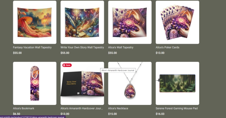 2. I also have a cute little Printify shop. It's still new and a work in progress, and I am arguing with myself over having an integrated Etsy shop, but before I have that long conversation I want to try and build up a decent amount of inventory. My little shop focuses specifically on the fantasy of everyday items. I'm a fantasy author, so I stick with that since I associate it with my books as a 'merchandising' thing. Bookmarks, journals, tapestries, jewelry, notebooks, sketchbooks, mousepads, desk covers, decks of cards, and puzzles. I am still toying around with the products, and creating the images for them is fun- as it's the only time I play around with the rage-inducing AI picture generators (sorry artists, I can't afford you yet).