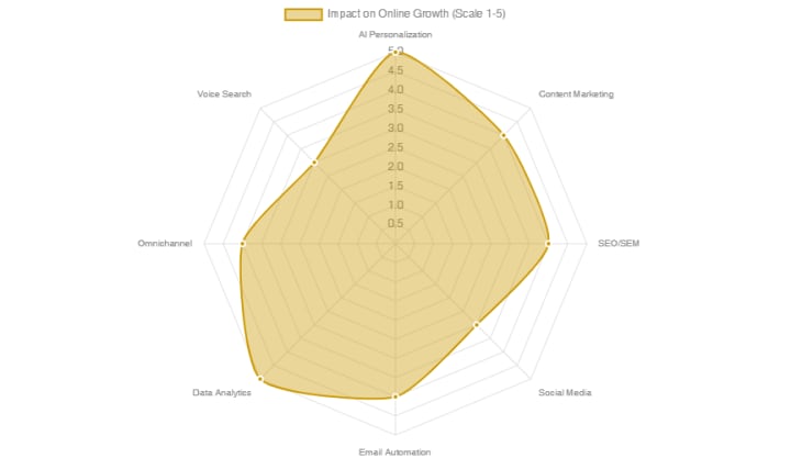 This radar chart illustrates the perceived impact of various digital marketing strategies on online business growth. Strategies like AI Personalization and Data Analytics show high impact due to their ability to optimize and target efforts effectively.