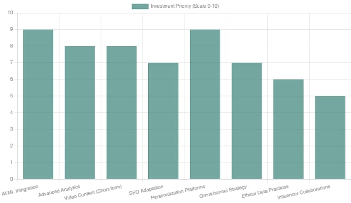 This bar chart outlines recommended investment priorities for various digital marketing areas, highlighting the importance of AI, analytics, and personalization for future growth.