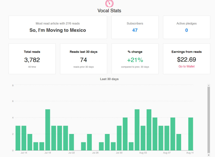 I get almost no views here on Vocal (and, until I got suspended for the second time, I got almost no views on my previous internet publishing home, Medium). On Vocal I have had just 74 reads in the past 30 days. I’ve been writing for close to seven years, one to three stories most days. It’s pretty exciting to think about how much time I have wasted.