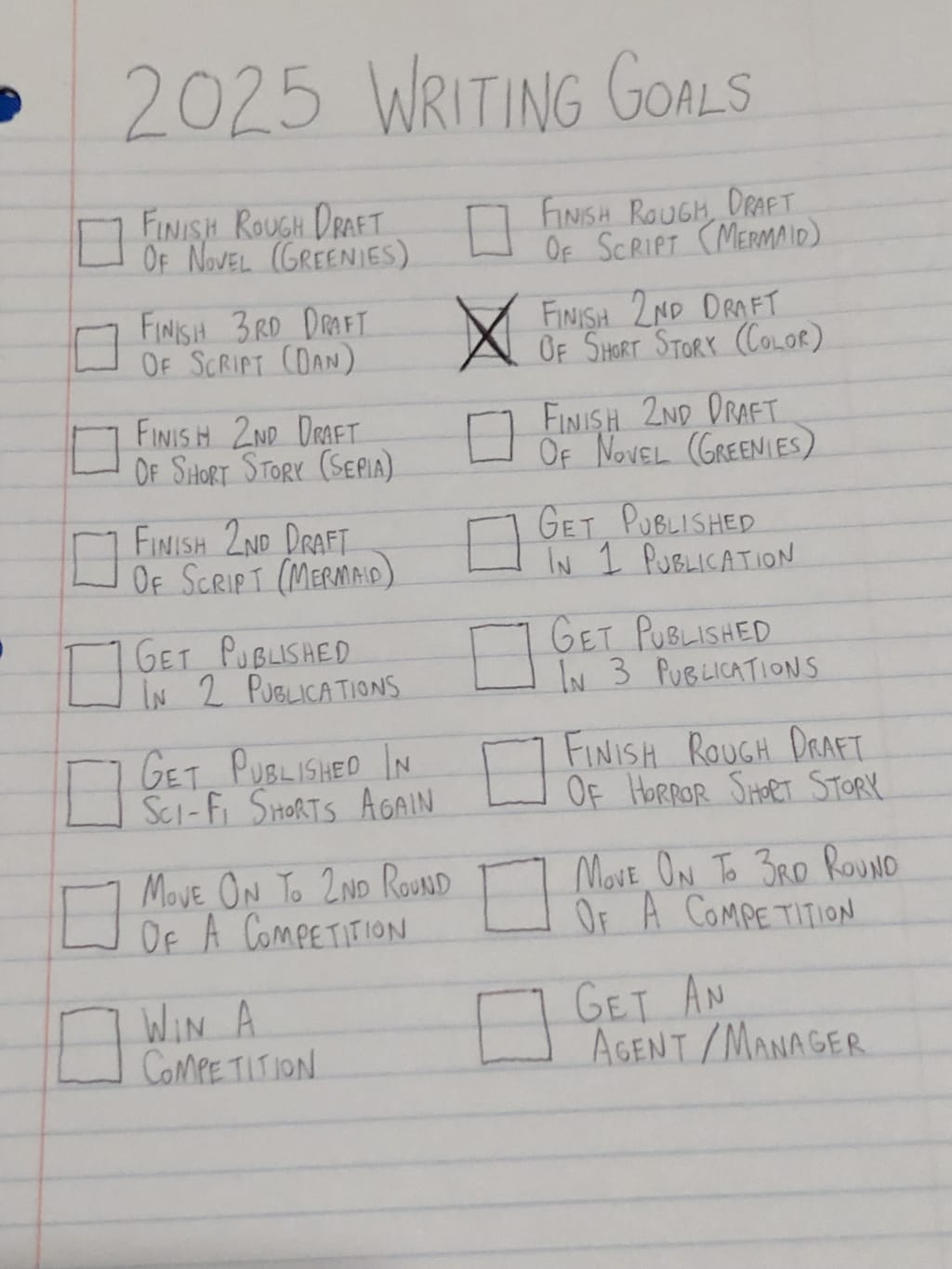 I put together a list of writing goals for the year of 2025. Admittedly, I assume there will wind up being more that pop up throughout the year, but I wanted to put down some things that were most important to me, and then try to get through as many of those as I could. It was 16 different goals I jotted down, and I assumed I wouldn't get through them all. But I wanted to try to get through as many as I could. Give myself constant goals on the horizon to strive for.