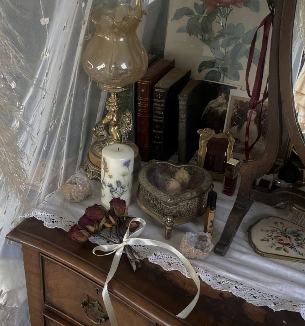 I settle down at my vanity, the one with the slightly chipped-off colour, and look at myself. My reflection mirrors my lost gaze. My reflection mirrors the lost gaze of the women before me. I sit in quietness and am embraced by tranquil solitude.