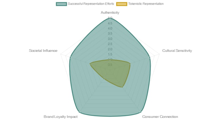 This radar chart illustrates a comparative analysis of "Successful Representation Efforts" versus "Tokenistic Representation" across key aspects crucial for effective marketing. A successful approach excels in authenticity, cultural sensitivity, fostering strong consumer connections, positively impacting brand loyalty, and contributing to broader societal influence, scoring highly (4-5). In contrast, tokenistic efforts typically score low (1-2) across these dimensions, highlighting their superficial nature and limited positive impact. The chart vividly demonstrates that genuine efforts resonate deeply and yield significant benefits, while superficial attempts fall short.