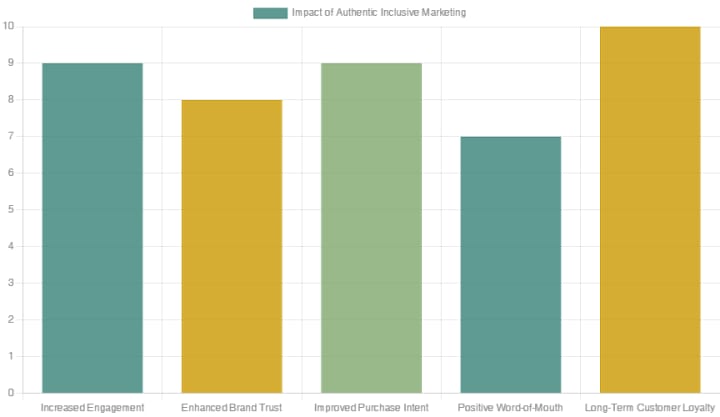 This bar chart illustrates the multifaceted impact of authentic inclusive marketing on various consumer and brand metrics, scaled from 0 to 10. "Increased Engagement" and "Improved Purchase Intent" score highly (9), indicating that consumers are more likely to interact with and buy from brands that authentically represent them. "Enhanced Brand Trust" also scores high (8), reflecting the deep trust built through genuine efforts. "Positive Word-of-Mouth" (7) shows the propensity of satisfied consumers to advocate for such brands, and "Long-Term Customer Loyalty" scores highest (10), emphasizing that authenticity is a cornerstone for sustained customer relationships. This chart reinforces the direct, quantifiable benefits of investing in truly inclusive marketing strategies.