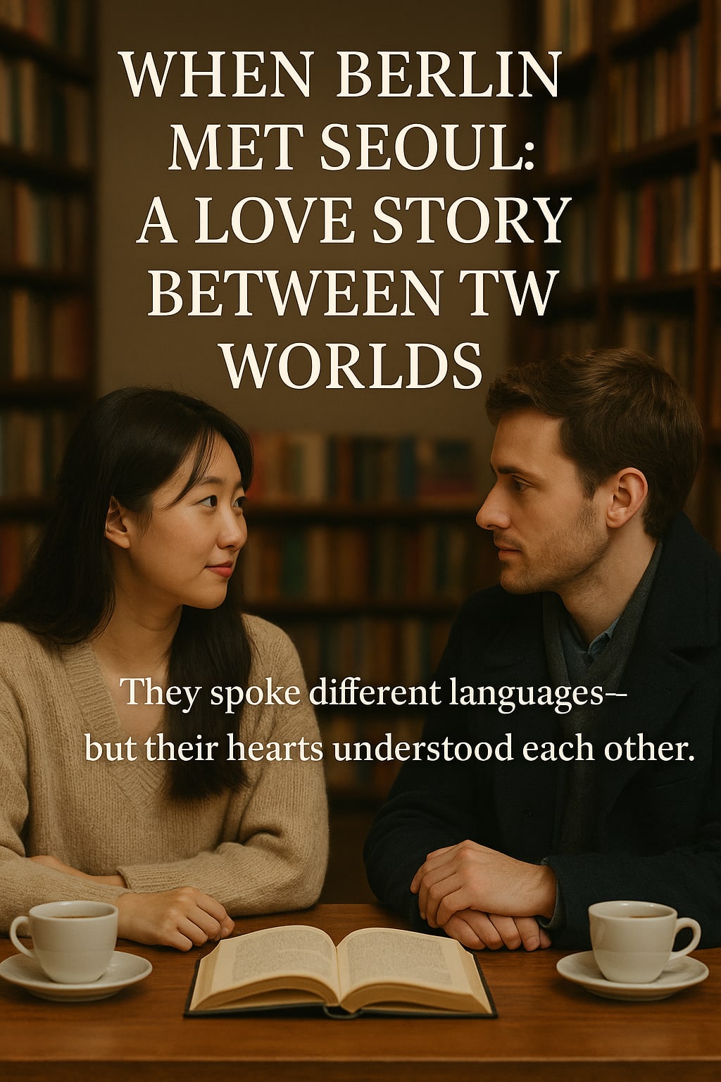 A softly lit image of a Korean girl and a European guy sitting in a cozy bookstore café with books and coffee cups between them—looking into each other’s eyes.